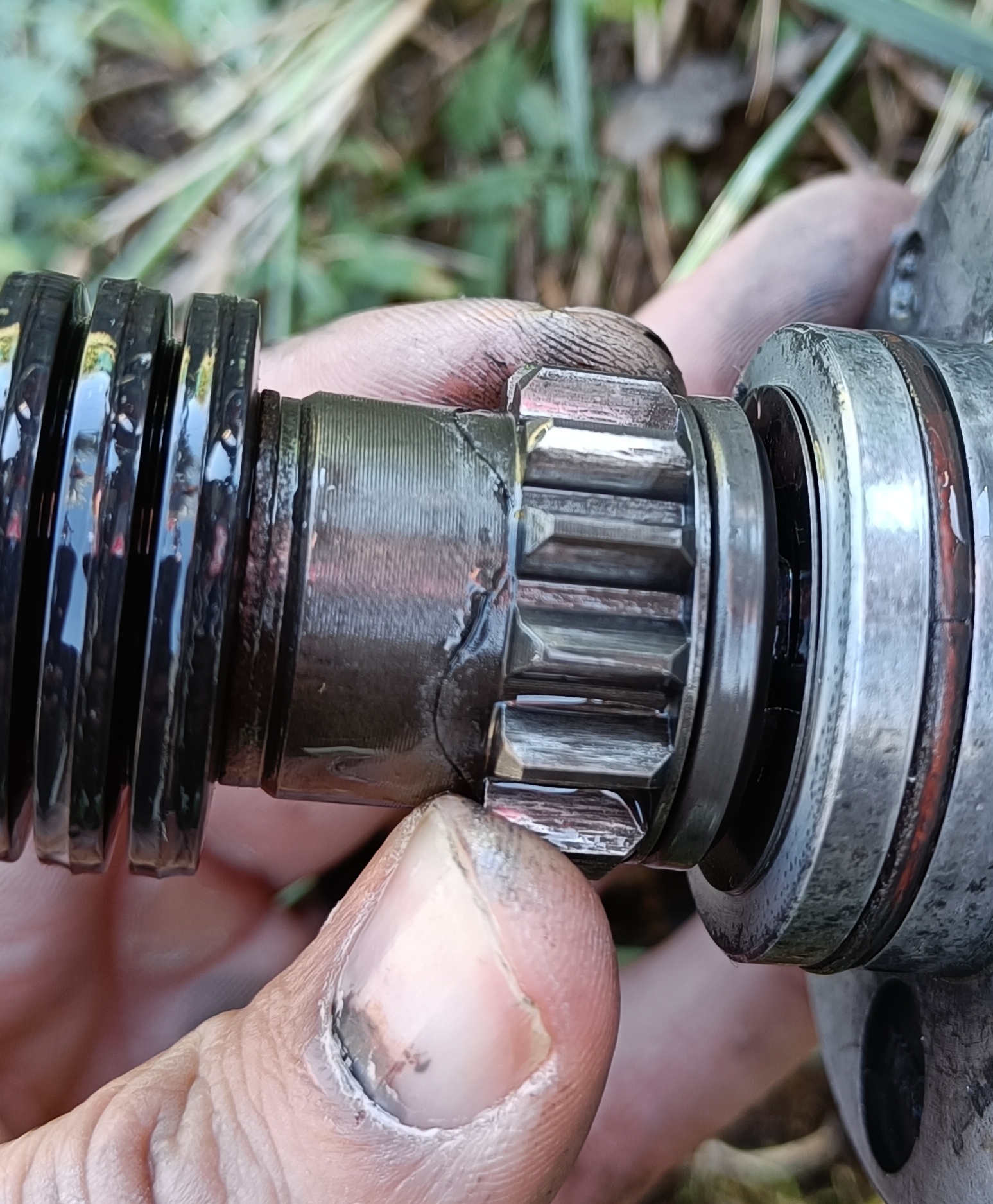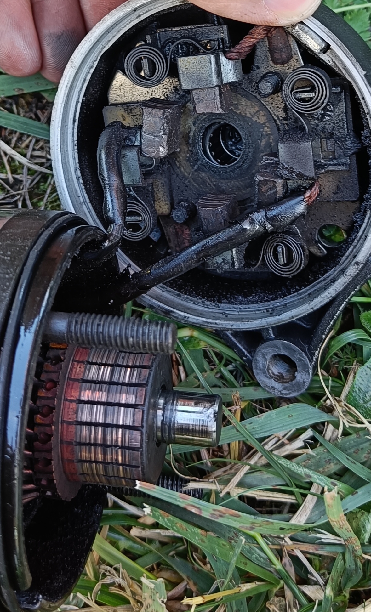 Hé bien le démarreur , est tout cassé , jamais vu ça ! Les câbles sont dénudés , les charbons uséd jusqu au trognon . Et surtout la partie métallique avec l engrenage est cassé net !!