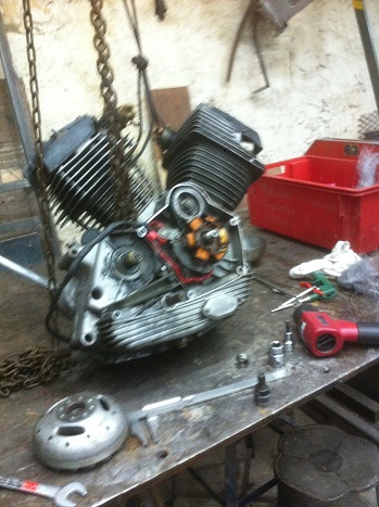 Bon c'est parti là j'en suis au nettoyage du moteur acheté au moi d'octobre. il était très sale (aau moins 30 ans de stockage au fond d'un garage professionnel) peut être 40, en plus les carter ont été peint en noir et les bords des ailettes de culasse aussi. il a fallu décaper tout ça