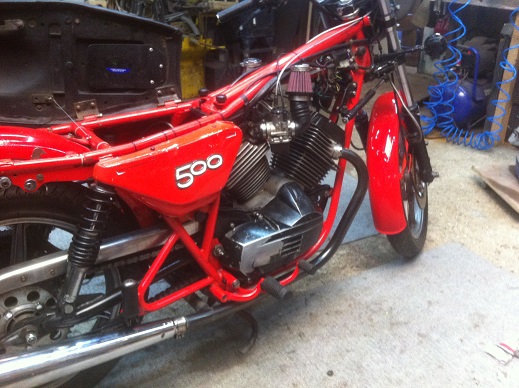 Le moteur est installé dans le cadre, j'a changer la courroie de distribution, réglé les culbuteur changer les cache culbu pour deux qui étaient plus beaux, monté le carter de transmission primaire qui permet le montage du démarreur, et là j'ai un nouveau défi à résoudre.